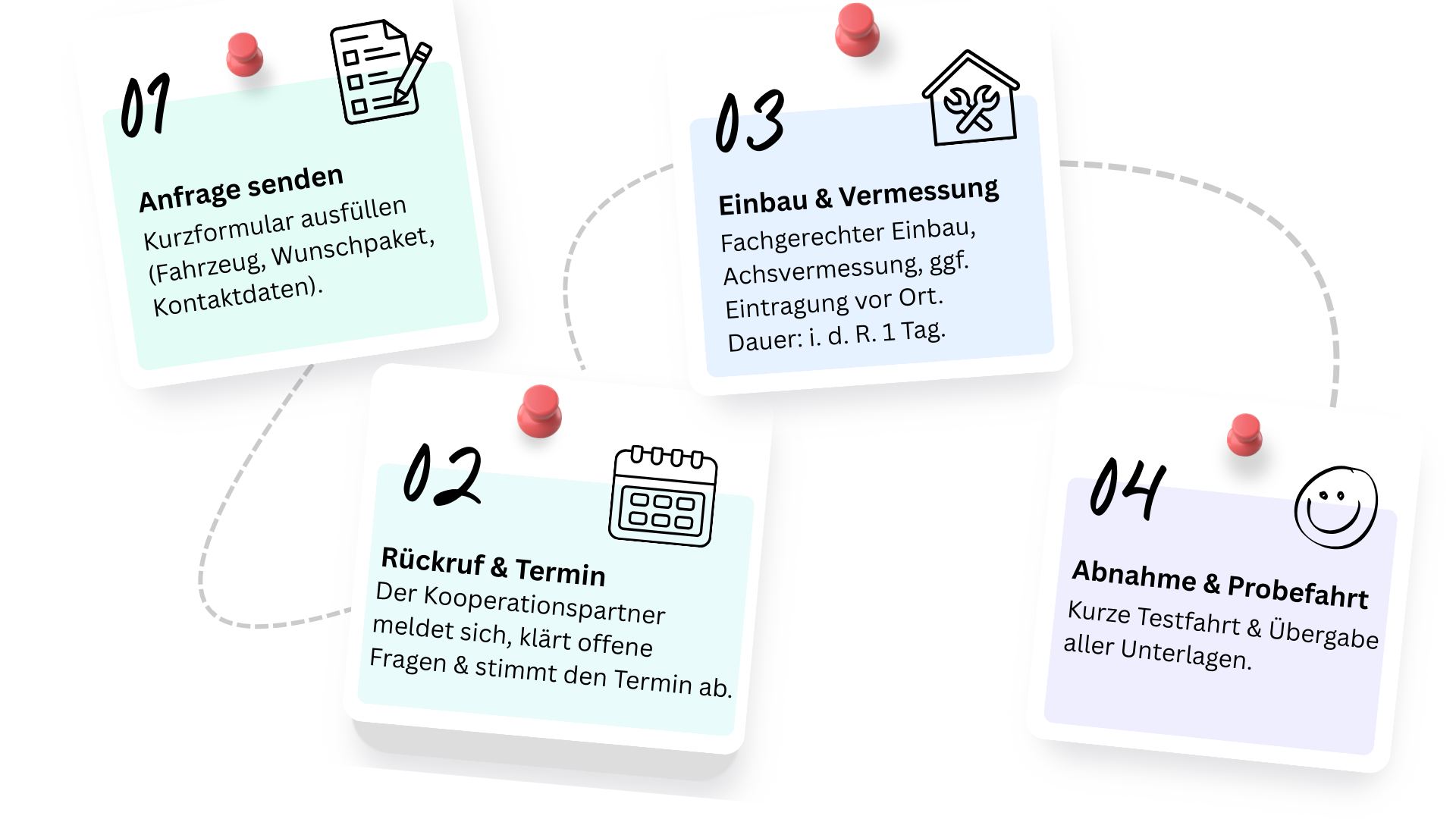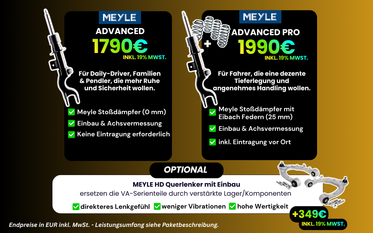 Material, Einbau, Achsvermessung, ggf. Eintragung. Festpreise - keine bösen Überraschungen.